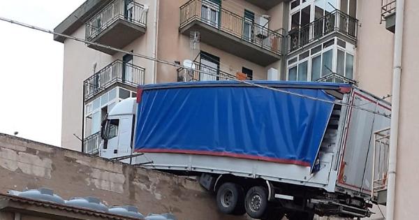 Un tir per cause in corso di accertamento è finito in bilico sui tetti di alcuni magazzini a Caccamo nel Palermitano. Il grosso mezzo è sospeso e minaccia una palazzina dove abitano sei famiglie.
