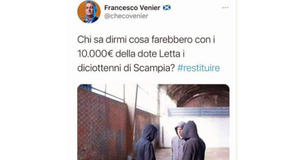 È polemica per un tweet del professor Francesco Venier, dell'Università di Trieste, che posta una foto di tre ragazzi incappucciati e scrive: «Chi sa dirmi cosa farebbero con i 10mila euro della dote Letta i diciottenni di Scampia?». Immediata la protesta sui social non solo di tanti napoletani, ma anche di politici e utenti del social. Altrettanto tempestiva la reazione dell'ateneo triestino che prende le distanze dalle «inopportune dichiarazioni» di Venier, «ricercatore dell' Ateneo, che ha parlato a titolo esclusivamente personale».