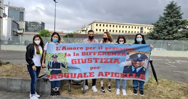 All'esterno del Palazzo di Giustizia di Napoli, al Centro direzionale, parenti e amici del poliziotto hanno esposto uno striscione con la scritta "L'amore per il prossimo fa la differenza. Giustizia per Pasquale Apicella". Sono tre gli imputati: Fabricio Hadzovic, 40 anni, Igor Adzovic, 39 anni, e Admir Hadzovic, 27 anni, tutti domiciliati nel campo rom di Giugliano.