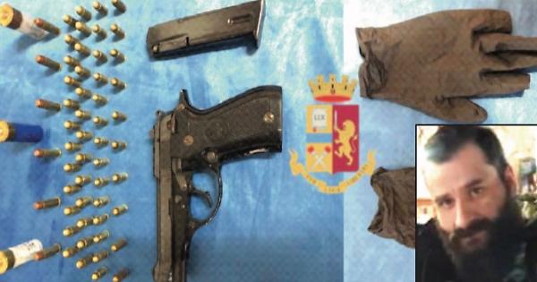 _ Nella foto la pistola, le munizioni e i guanti finiti sotto sequestro; nel riquadro l’arrestato Rosario Iorio