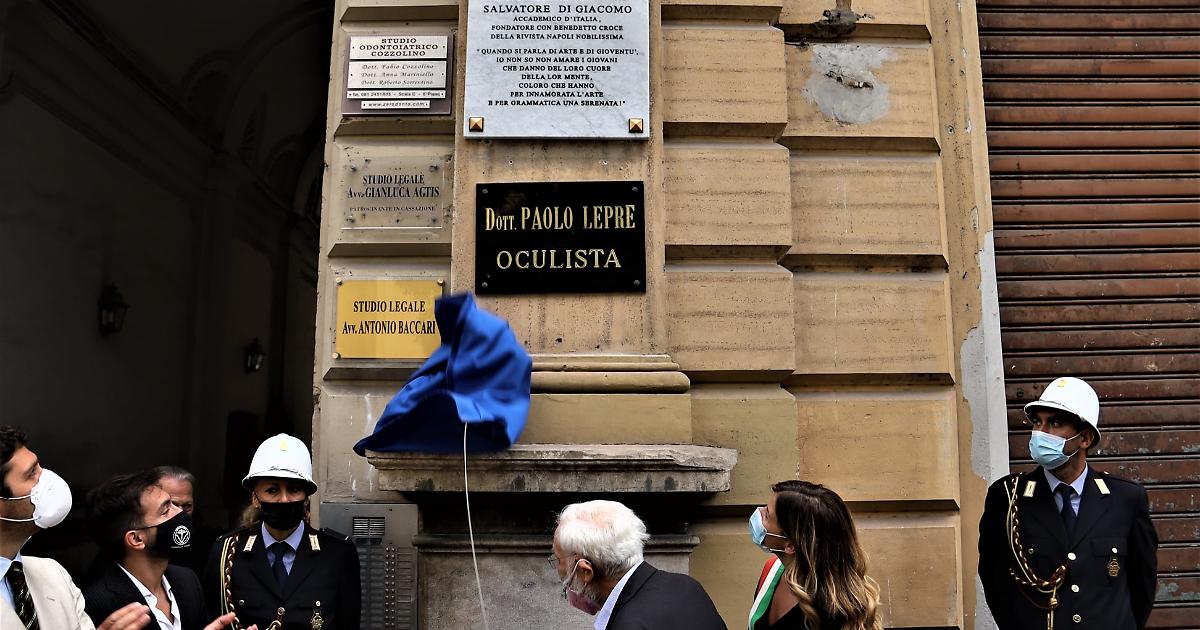 NAPOLI. Si è svolta stamani, alla presenza dell’assessora alla toponomastica Alessandra Clemente, la cerimonia di scoprimento della targa dedicata a Salvatore di Giacomo, poeta e drammaturgo, autore della canzone “Era de Maggio”, che ha abitato in quel palazzo al civico 107 di via Santa Lucia dal 1916 al 1932.