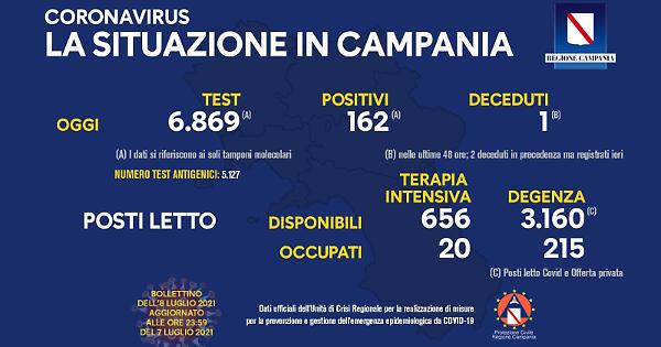 L'unita' di crisi della regione Campania ha reso noto che i positivi del giorno sono 162. I tamponi molecolari del giorno sono 6.869 e quelli antigenici 5.127. Un nuovo decesso (Nelle ultime 48 ore; 2 deceduti in precedenza ma registrati ieri).