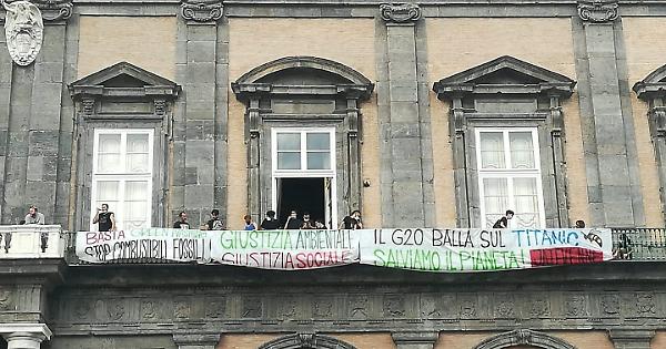 Un gruppo di attivisti della rete Bees Against G20 ha effettuato un blitz all'interno di Palazzo Reale, che ospiterà nei prossimi giorni il G20 dei ministri dell'Ambiente, esponendo tre striscioni: “Basta green washing stop combustibili fossili"; “Giustizia ambientale" e “Il G20 balla sul Titanic, salviamo il pianeta".