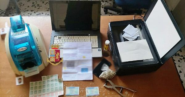 NAPOLI. Stamattina gli agenti della Squadra Mobile hanno effettuato un controllo in vico Tavernola presso l’abitazione di un uomo dove hanno rinvenuto una postazione informatica dotata di computer, due stampanti, di cui una a nastro per la stampa su documenti elettronici, 43 marche da bollo raffiguranti l’effigie del Comune di Napoli, materiale utilizzato per la fabbricazione e plastificazione di documenti da falsificare, un “Green Pass” e tre carte d’identità elettroniche false di cui due senza intestazione.