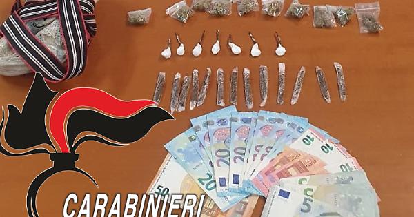 In un borsello che il 20enne portava a tracolla i militari hanno rinvenuto altre 7 dosi di cocaina, 13 stecchette di hashish e 10 bustine di marijuana. E ancora 350 euro in contante ritenuto provento illecito e materiale vario per il confezionamento delle dosi.