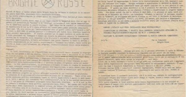 Il volantino con intestazione Brigate Rosse e la stella a cinque punte all'interno di un cerchio, inizia recitando: "Giovedì 16 marzo un nucleo armato delle Brigate Rosse ha catturato e rinchiuso in un carcere del popolo Aldo Moro, presidente della Democrazia Cristiana..." E si chiude con la data "16/3/78" e la firma "Per il Comunismo Brigate Rosse".