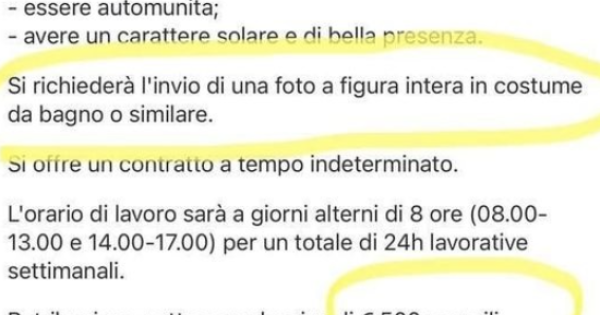 Azienda pubblica un annuncio per la ricerca di una receptionist richiedendo anche l'invio di una foto in costume. L'annuncio è relativo ad un lavoro in un ufficio nel Centro direzionale di Napoli e l'offerta di lavoro è stata pubblicata anche su diversi siti web specializzati. In alcuni è stata poi corretta, omettendo la richiesta di foto in costume.