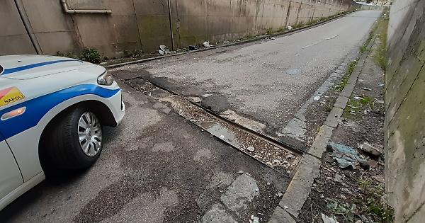Nuovo furto di grate al Centro Direzionale di Napoli. Per evitare incidenti un'auto della polizia municipale ha deviato il traffico bloccando una delle strade che portano al Tribunale.