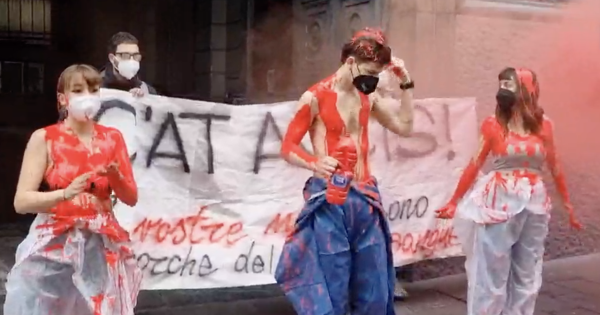 I tre manifestanti, vestiti da operai, si sono spogliati di finti abiti da lavoro e hanno versato sul loro corpo della vernice rossa, «simbolo delle morti di Lorenzo e Giuseppe, i due giovani deceduti durante l'alternanza scuola-lavoro e lo stage», spiegano gli attivisti in una nota. «Il Pd - sostengono gli organizzatori - è il primo responsabile delle morti di Lorenzo e Giuseppe».