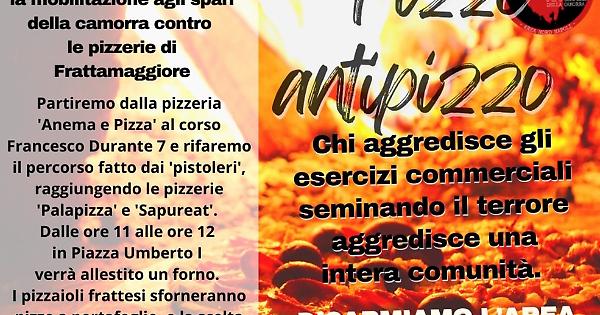 FRATTAMAGGIORE. Domani, venerdì 25 marzo, alle ore 10 contro la prepotenza, la sopraffazione e la tracotanza dei clan rispondiamo con la mobilitazione agli spari della camorra contro le pizzerie di Frattamaggiore. Si partirà dalla pizzeria 'Anema e Pizza' al corso Francesco Durante 7 e sarà rifatto il percorso fatto dai 'pistoleri', raggiungendo le pizzerie 'Palapizza' e 'Sapureat'. I negozianti saranno invitati ad adottare il nostro simbolo 'O si è contro la camorra o si è complice della camorra'. Affiggere l'adesivo alla vetrina del proprio esercizio commerciale rappresenta un piccolo gesto dal grande significato: 'Mi schiero contro il potere e la logica della camorra'. Dalle ore 11 alle ore 12 in piazza Umberto I verrà allestito un forno per le 'Pizze antipizzo'. I pizzaioli frattesi sforneranno pizze a portafoglio, e la scelta non è casuale, che saranno offerte alla popolazione. Chi aggredisce gli esercizi commerciali seminando il terrore aggredisce una intera comunità. Disarmiamo l’Area Nord di Napoli. L'iniziativa è organizzata dal Comitato di liberazione dalla camorra Area Nord e La Buona Tavola Magazine a cui, tra l'altro, hanno aderito : Comune di Frattamaggiore, Cgil, Cisl e Uil Napoli, Partito Democratico di Napoli e Frattamaggiore, associazione Libera, Finetica onlus.