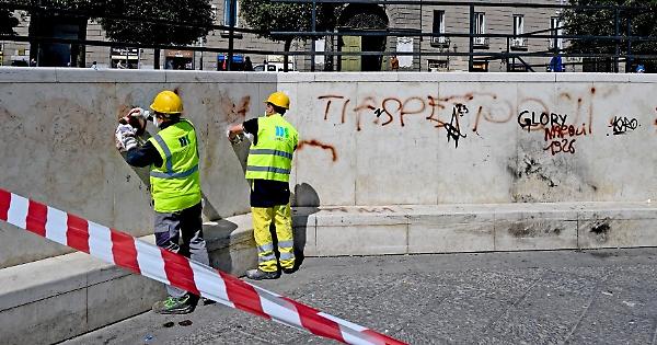 NAPOLI. Questa mattina gli operai della Napoli Servizi hanno effettuato, su richiesta dell'Amministrazione comunale, un intervento di pulizia straordinaria su muretti e panchine di piazza Municipio che erano stati imbrattati da fregi e scritte vandaliche.