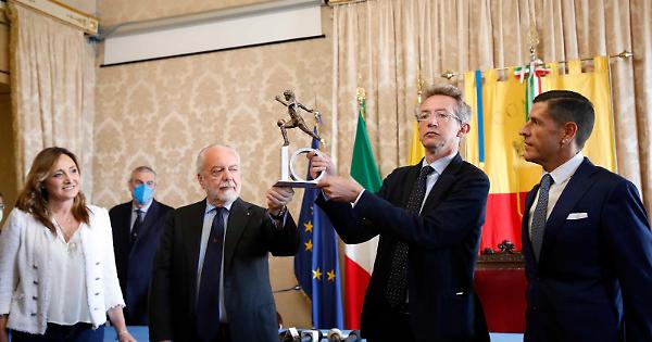 Una statua “monumentale" del piede sinistro di Diego Armando Maradona a Scampia, quartiere della zona nord di Napoli. La immagina così Aurelio De Laurentiis, patron del Calcio Napoli, che oggi nella sede del Comune di Napoli ha ricevuto dall'amico di Maradona Stefano Ceci una riproduzione del piede sinistro del Pibe de Oro, primo di 500 esemplari che sono stati venduti a collezionisti in giro per il mondo.