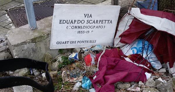 NAPOLI. Il nome di Eduardo Scarpetta, inciso una targa toponomastica in marmo per indicare una strada a lui dedicata, che giace tra monnezza, sterpaglia e macerie è il simbolo del degrado delle periferie napoletane e del poco rispetto che viene riservato ai grandi della cultura partenopea. È quello che accade a Ponticelli, nella periferia orientale della città, come è stato segnalato da alcuni cittadini al Consigliere Regionale di Europa Verde Francesco Emilio Borrelli. «È un’immagine che ci provoca profonda tristezza e grande delusione. Il ricordo di chi ha contribuito a rendere grande la nostra città e la sua storia viene gettato, letteralmente, nella spazzatura. Ci fa capire, ancora una volta, che troppe persone non provano amore per il proprio territorio e non hanno rispetto per nulla. Al contempo, bisogna cominciare ad amministrare in modo del tutto differente la città tutta, a partire proprio dalle periferie che non posso più essere considerate il tappetino sotto il quale nascondere la polvere anche perché ormai da tempo essa è strabordata. Serve un cambiamento radicale», ha commentato il consigliere Borrelli.