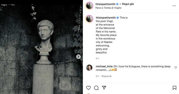NAPOLI. Continua la storia d'amore tra Patti Smith e la città di Napoli. Dopo la visita al Pio Monte della Misericordia, la sacerdotessa del rock pubblicato sui social le foto del Parco Vergiliano. «Questi è il poeta Virgilio, all'ingresso del Parco della Memoria in suo nome. Il mio posto preferito nella meravigliosa città di Napoli, accogliente, grintosa e bella» scrive sui social.