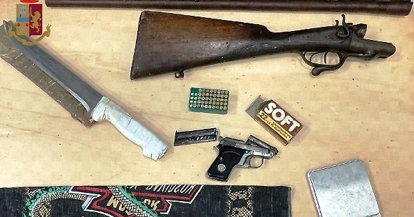 I poliziotti, giunti sul posto, hanno identificato i due uomini e hanno trovato il più giovane in possesso di un involucro con circa 8,5 grammi di hashish e un bilancino di precisione; inoltre, nella cantina in uso all’altro inquilino, hanno rinvenuto una pistola Beretta cal. 22 corto con matricola abrasa e completa di caricatore con 6 cartucce, uno scatolino contenente 41 cartucce cal. 22, un fucile da caccia privo di matricola e un coltello con la lama di 26 cm.