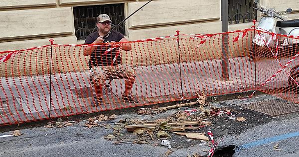 NAPOLI. «Se sottolineando una problematica, si riesce ad aggiungere un sorriso, allora i problemi intossicano meno e le soluzioni arrivano in fretta». Ruben D’Agostino è uno street artist, non nuovo a creazioni che dal gioco passano poi all’azione civica e sociale. Un giorno si lascia fotografare al Vomero, in via Andrea Vaccaro, seduto su uno sgabello con una canna da pesca in mano, mentre cerca di pescare qualcosa dalla voragine che tiene chiusa la strada.
