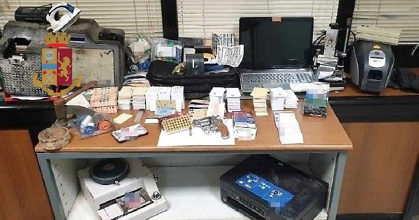 Ancora, gli agenti hanno rinvenuto nell’abitazione due patenti di guida senza dati anagrafici e due carte di credito contraffatte, mentre in un locale adibito a deposito in uso all’uomo hanno trovato 50 cartucce calibro 9x21; inoltre, nello stesso locale, hanno notato che vi era una botola metallica che portava in un terraneo in cui hanno rinvenuto 9 patenti di guida, di cui 5 false, 11 codici fiscali presumibilmente falsi e 5 falsi, una carta d’identità ed un bancomat falsi, 22 carte di credito presubibilmente false ed un’altra intestata ad un’altra persona, 48 patenti di guida in bianco, 498 tessere di colore bianco in PVC, 211 tessere magnetiche, 134 striscette per residenze patente di guida, 308 marche da bollo intestate a diversi comuni italiani, 126 bollini per carte di credito e numerosi supporti e materiale informatico per la produzione dei documenti.