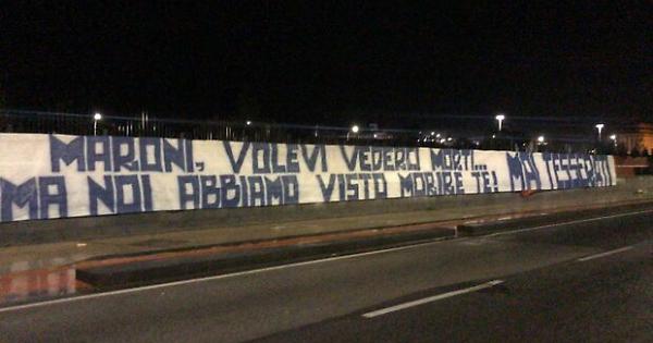 "Maroni, volevi vederci morti... ma noi abbiamo visto morire te! Mai tesserati". Questo il testo di uno striscione apparso nella notte a Napoli, poi rimosso. Chi ha esposto lo striscione lo ha fotografato e ha poi diffuso l'immagine sui social network, dove il contenuto dello striscione sta facendo molto discutere.