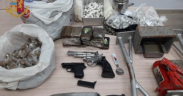 FRATTAMAGGIORE. Agenti del Commissariato di Frattamaggiore hanno effettuato un controllo in via Trieste a Frattamaggiore presso un’abitazione in uso ad un uomo dove, in un’auto parcheggiata nel cortile, hanno rinvenuto una pistola magnum 357 Smith e Wesson, una pistola Beretta cal. 6,35 con una cartuccia e priva di matricola, un coltello della lunghezza di 20 cm, 930 involucri contenenti circa 1,4 kg di marijuana, 19 panetti di hashish del peso di circa 1,9 kg, numerose dosi contenenti circa 570 grammi di cocaina e diverso materiale per il confezionamento della droga.