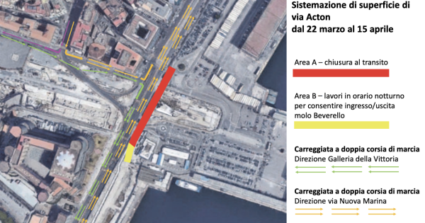 VIA ACTON. Per il proseguimento della sistemazione di superficie di via Acton, da mercoledì prossimo (22 marzo) al 15 aprile verrà chiusa la carreggiata di via Acton (lato mare) con la conseguente deviazione del traffico veicolare nella corsia del tram. Nell’ambito della stessa cantierizzazione la società Terna Spa eseguirà gli interventi di propria competenza relativi alla posa del nuovo cavo in sostituzione dell’esistente ad olio fluido.