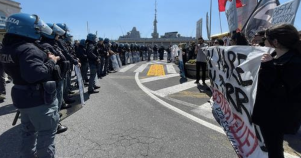Momenti di tensione tra manifestanti e polizia all'esterno della stazione marittima di Napoli dove sta per iniziare un evento sui beni confiscati con Matteo Piantedosi, ministro dell'Interno, e Marco Minniti, ex ministro dell'Interno. I manifestanti hanno provato ad avanzare per consegnare a Piantedosi una corona di fiori in memoria de migranti morti in mare, ma la polizia, in assetto anti sommossa, li ha respinti.