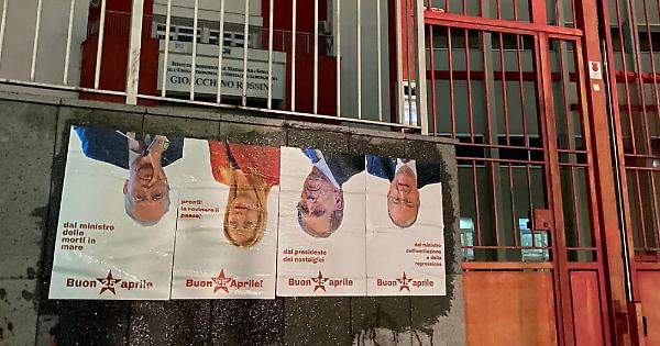 Sui manifesti la foto di Meloni è accompagnata dalla scritta "Pronti! (a rovinare il paese)"; sugli altri manifesti la scritta "Buon 25 aprile" è accompagnata, nel caso di La Russa, dalla scritta "dal presidente dei nostalgici", Valditara dalla scritta "dal ministro dell'umiliazione e della repressione" e la foto di Piantedosi dalla scritta "dal ministro delle morti in mare". Gli attivisti del centro sociale Ex Opg - Je so' pazzo, dal quale è nata l'esperienza politica di Potere al Popolo, rivendicano l'azione e scrivono: "Dalle strade, dalle piazze, dalle scuole e dalle università arriva un messaggio semplice e chiaro: Napoli è, e sempre sarà, antifascista. Napoli ripudia questo governo, il governo dell'odio, e lo ribadiamo a gran voce in occasione del 25 aprile, giornata in cui ricordiamo il sacrificio dei partigiani, di centinaia di migliaia di donne e uomini che si organizzano, coraggiosamente, per liberare questo paese dal nazifascismo. La pagina di storia più bella e fiera per l'Italia, quella costruita, desiderata, gioita collettivamente, quest'anno assume un significato e un'importanza diversi, durante l'anno del governo dell'odio, il governo più a destra nella storia della nostra Repubblica".