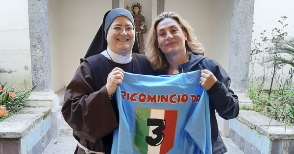 Non sarà allo stadio ma se le cose andranno come ogni napoletano spera, la monaca ha già pronta una camicia azzurra speciale da indossare con la scritta “Ricomincio da 3". La madre abbadessa la ha postata sui social «pronta da indossare» oggi «o quando sarà. - scrive - Ormai il tempo è sospeso».