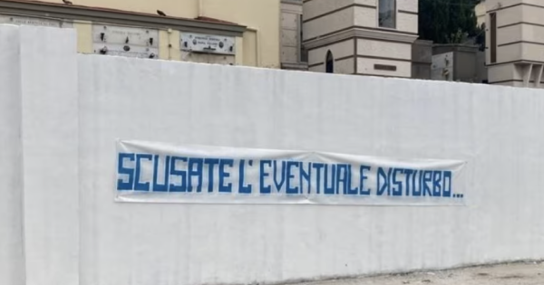 “Scusate l'eventuale disturbo". È l'ironico striscione apparso fuori dal cimitero di Napoli, nelle ore prima del match con la Salernitana che avrebbe regalato agli azzurri il terzo scudetto della loro storia. Il gol del pareggio dell'attaccante granata Boulaye Dia ha rimandato la festa azzurra ai prossimi giorni.