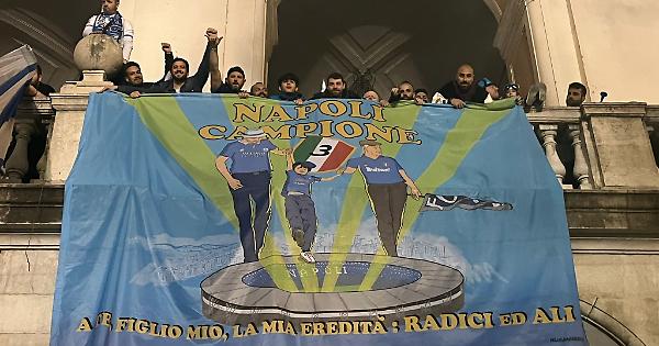La festa scudetto ha coinvolto tutta la città. Ogni quartiere ed ogni suo simbolo. Tanti i tifosi ed i turisti che la scorsa notte hanno invaso Napoli, colorandola di azzurro. Molti di coloro che erano in strada hanno vissuto la loro prima esperienza, la loro prima grande vittoria, perché al tempo di Diego o non erano ancora nati o erano troppo piccoli. È l’esempio di un gruppo di amici di sana fede azzurra della zona Corallo, Vasto e Secondigliano che si è fatto ritrarre davanti al Real Albergo dei Poveri, a piazza Carlo III, proprio come 33 anni con la differenza che ora sono adulti ed all’epoca poco più che bambini. Un modo per dire “siamo ancora qua, tutti uniti, e siamo tornati a vincere”. Una bandiera per l'occasione commissionata ad un fumettista per unire le diverse generazioni vincenti azzurre con una frase che prende spunto da una citazione del giornalista americano William Hodding Carter: “A te figlio mio, la mia eredità: radici ed ali”.