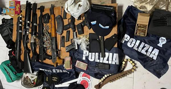 Inoltre, i poliziotti hanno effettuato un controllo presso un deposito in uso all’uomo in via Dante a Casalnuovo di Napoli dove hanno rinvenuto, in un baule di grosse dimensioni chiuso da lucchetti, altre 3 pistole con matricola abrasa, due fucili a canne mozze, un fucile a pompa, 2 kalashnikov, 489 proiettili di vario calibro, un passamontagna, paline, casacche e berretti con loghi della Polizia di Stato e mascherine con la scritta “Guardia di Finanza”, nonché un lampeggiante, un dispositivo jammer, una radio trasmittente, un giubbotto antiproiettile, due fondine per pistola, 30 fascette in plastica preinstallate ad uso “manette”, un DVR, un flex ed alcune borse con capi di abbigliamento.
