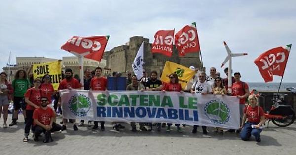 Pannelli fotovoltaici e pale eoliche realizzati in cartone e posti davanti a Castel dell'Ovo, sede del segretariato regionale del ministero della Cultura, a NAPOLI, in segno di protesta. Stamattina Legambiente, Uds, Udu, Link, Friday For Future, Cgil, Fiom, Arci Campania, Wwf e Greenpeace hanno manifestato sotto lo striscione "Scatena le rinnovabili", per ribadire al governo Meloni l'urgenza di "accelerare lo sviluppo delle rinnovabili, delle comunità energetiche e la realizzazione di nuovi impianti, sotto scacco di ritardi burocratici e ostacoli normativi. A pesare prima di tutto è la lentezza degli iter autorizzativi e le lungaggini burocratiche di enti e Soprintendenze ai beni culturali, i due principali colli di bottiglia dei processi autorizzativi", denunciano. In Campania nel 2022 sono presenti 3.406 Mw di potenza installata da fonti rinnovabili con oltre 49mila impianti presenti nel territorio regionale, ma rispetto all'anno precedente sono stati installati appena 160 Mw di nuova potenza rinnovabile elettrica, di cui il 54% è caratterizzato da fotovoltaico, seguito poi dall'eolico con il 44%. La produzione di energia elettrica da fonti rinnovabili al 2021 è di 6.326 GWh, pari al 52% del totale dell'energia elettrica prodotta sul territorio regionale. "Uno stallo impiantistico - spiegano i promotori della manifestazione - che di certo non dipende dalla burocrazia campana, che negli ultimi anni in questa materia sembrerebbe invece correre veloce grazie anche alla capacità di mediazione con enti e imprese per migliorare i progetti e renderli compatibili con il territorio. Un approccio vincente che, per essere ancora più efficace, necessita di risorse umane per potenziare uffici regionali e locali dedicati e commissioni"