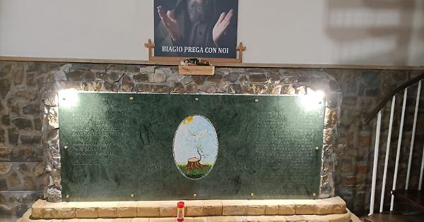 Oggi si aggiunge la lastra marmorea con il mosaico. Su di essa è stata incisa la frase di fratel Biagio, una frase scritta su un foglietto che egli donava a tanti all’inizio della sua missione: «Ciao sono un pellegrino, ma soprattutto sono un discepolo di Gesù che ha da compiere una grande missione, ma ognuno di noi deve compiere una grande missione e per questo che dobbiamo prenderci ciascuno le nostre responsabilità perché ogni professione deve svolgere un lavoro per il proprio bene e soprattutto per il bene di tutti quanti. Come fratello vi auguro in ogni momento serenità pace e tanta pazienza. Non scoraggiatevi mai e andate sempre avanti, scavalcando così qualunque ostacolo potrete incontrare in questa vita».