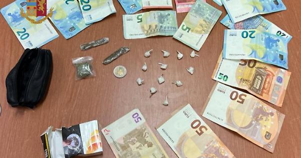 I poliziotti hanno bloccato i due spacciatori trovandoli in possesso di 392 euro mentre la donna è riuscita ad allontanarsi facendo perdere le sue tracce; inoltre, nello stipite della porta di uno scantinato e su una cornice metallica sotto i porticati dell’edificio, hanno rinvenuto due stecche di hashish del peso di circa 3 grammi, una bustina contenente circa un grammo di marijuana e 12 involucri contenenti circa 4 grammi di cocaina.