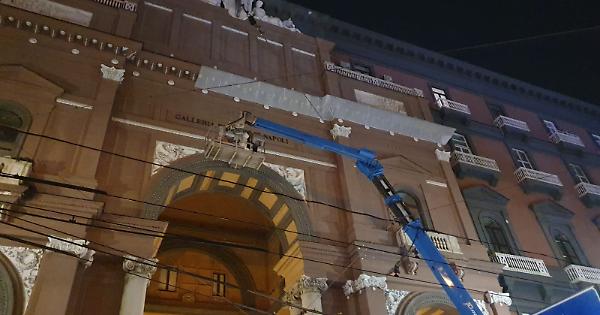 NAPOLI. Proseguono gli interventi per la messa in sicurezza della facciata della Galleria Principe di Napoli in Via Pessina. Concluse le verifiche e i saggi sulla muratura e sui fregi, i tecnici della Napoli Servizi con il supporto di una ditta specializzata stanno procedendo al posizionamento delle reti protettive anticaduta calcinacci (già installati 200 mq di rete su un totale di circa 500 mq. Successivamente sarà montata una mantovana di protezione che andrà a liberare l’area attualmente occupata dalle transenne che delimitano il passaggio.