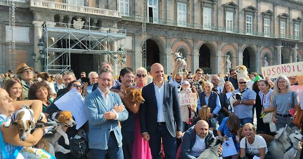 Una manifestazione in piazza del Plebiscito per protestare contro l'applicazione del regolamento che vieta l'accesso ai cani del giardino storico di Palazzo Reale, a Napoli. Un inedito sit-in, promosso dal comitato cittadino dei proprietari di cani “Qua la zampa", con cartelli e megafoni per far conoscere a tutti le loro ragioni, tenendo tra le braccia o al guinzaglio cani di tutti i tipi e tutte le taglie.