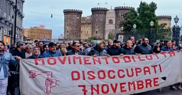 Alcune centinaia di disoccupati hanno percorso in corteo le strade del centro di Napoli, chiedendo "soluzioni concrete" al tavolo che è in corso in Prefettura, alla presenza del sottosegretario al Lavoro Claudio Durigon. I manifestanti appartengono al 'Movimento 7 Novembre' e altre sigle: chiedono l'avvio di percorsi per l'inserimento occupazionale e sollecitano decisioni concrete ai rappresentanti istituzionali che si incontrano nel palazzo di Governo. Reggendo uno striscione con la scritta "Gli impegni assunti vanno mantenuti" i disoccupati hanno acceso fumogeni davanti al teatro San Carlo, per poi fermarsi in piazza del Plebiscito, davanti alla Prefettura, per attendere gli esiti del tavolo.
