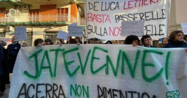 Gli attivisti hanno esposto uno striscione con la scritta "Jatevenne! Acerra non dimentica" e cartelli che invocavano la bonifica del territorio. "I morti della Campania - evidenziano i manifestanti - gridano vendetta: gli impianti di morte, gli sversamenti abusivi, i roghi rappresentano una ferita ancora aperta nel cuore dei cittadini e delle cittadine. Non tollereremo ulteriormente le passerelle di chi prova a ripulirsi la faccia provando ad interpretare il malcontento contro il governo guidato da Giorgia Meloni, noi conosciamo la verità: la sanità, il lavoro, il welfare in Campania li ha smantellati pezzo a pezzo Vincenzo De Luca, illudersi del contrario vuol dire illudersi di una bugia. Rimaniamo in piazza, per strada, in trincea per la battaglia a difesa della nostra terra".