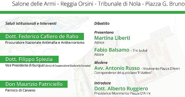 NOLA. Entra in Scena la Legalità è il titolo del convegno organizzato dal Movimento Piazza d’armi, che avrà luogo venerdì 23 febbraio, con inizio alle 9.30, nel Salone delle Armi del tribunale di Nola, in piazza Giordano Bruno. A fare gli onori di casa il Dott. Alberto Ruggiero, Presidente del Movimento Piazza d’Armi. Al tavolo dei relatori siederanno il: dott. Federico Cafiero de Raho, procuratore nazionale antimafia e antiterrorismo; dott. Filippo Spiezia, vice presidente di Eurojust e don Maurizio Patriciello, parroco di Caivano. Per l’occasione interverranno l’attrice Martina Liberti e l’attore Fabio Balsamo, the Jackal. Al convegno nazionale si giunge dopo un’accurata indagine statistica condotta dal Movimento che vede al centro delle preoccupazioni degli studenti bullismo e inquinamento ambientale.