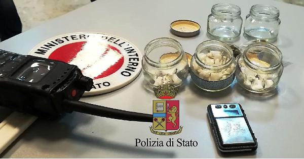 NAPOLI. Ieri gli agenti del Commissariato di Polizia di Stato Vicaria-Mercato hanno arrestato Giovanni Esposito, di 23 anni, per detenzione di droga ai fini di spaccio. I poliziotti durante un servizio controllo del territorio, nel transitare nel vico Croce Sant'Agostino, hanno notato diverse persone che entravano e uscivano dal terraneo. Gli agenti si sono insospettiti quando hanno notato un giovane entrare e poco dopo uscire velocemente dietro Esposito. Quest’ultimo alla vista dei poliziotti dava segni di disagio e nervosismo e cercava di chiudere il portone, ma gli agenti, approfittando della situazione, sono immediatamente entrati all’interno del terraneo e hanno rinvenuto sul tavolo tre bustine contenenti marjuana e 85 vasetti in vetro di cocaina, oltre ad un bilancino di precisione ancora sporco della sostanza. Sequestrato anche un impianto di videosorveglianza, provvisto di 4 telecamere e due monitor. Sul tavolo sono state rinvenute altresì diverse banconote di cinque e dieci euro per un totale di euro 170. Il locale è stato sottoposto a sequestro insieme al telefono cellulare. Gli agenti, su disposizione dell’autorità giudiziaria, hanno condotto Esposito presso la Casa Circondariale di Poggioreale.