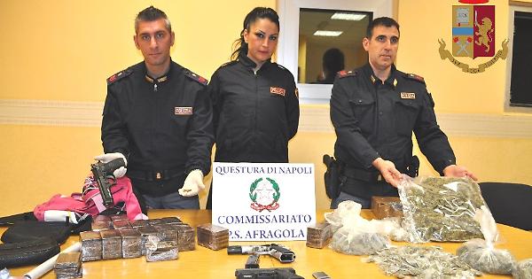 AFRAGOLA. Fermato per un controllo mentre era alla guida della sua auto, è stato trovato con armi e droga. E' successo ieri sera ad Afragola, nel Napoletano, dove gli agenti della Polizia di Stato hanno arrestato Andrea Castaldo, trentenne incensurato, per detenzione ai fini di spaccio di sostanze stupefacenti, detenzione di armi e munizioni nonché ricettazione. I poliziotti lo hanno visto procedere con la sua auto a forte velocità quindi gli hanno intimato l'alt mentre l'uomo ha tentato la fuga speronando anche un'auto in sosta ma gli agenti sono riusciti a fermarlo in via Leopardi. Sul sedile dell'autovettura, lato passeggero, gli agenti hanno trovato un marsupio nero con all'interno 3 'panetti' di hashish, per un peso di 295 grammi, una busta con 100 grammi di marijuana, e 12 grammi di cocaina. I poliziotti hanno deciso di perquisire anche l'abitazione del 30enne dove hanno trovato e sequestrato una pistola Beretta calibro 9x21 con matricola abrasa e due proiettili nel caricatore; una pistola Glock calibro 9x21 con matricola abrasa e 5 proiettili nel caricatore; una pistola Tanfoglio, calibro 9x21 completa di caricatore e di matricola risultata rubata nel 2011. A casa dell'uomo, nel cesto della biancheria sporca in bagno, è stata trovata un'ingente quantità di droga fra marijuana, hashish e cocaina oltre a un bilancino di precisione, un taglierino, un rotolo di cellophane e 300 bustine per il confezionamento delle singole dosi. In totale sono stati sequestrati 977 grammi di marijuana, quasi 8 chili di hashish e 42 grammi di cocaina. L'uomo si trova ora nel carcere di Napoli Poggioreale.