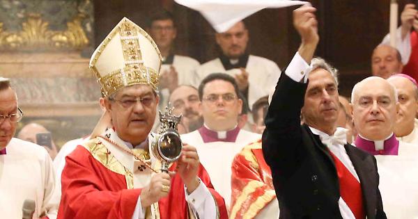 Nel momento in cui il cardinale Crescenzio Sepe ha prelevato l'ampolla dalla teca il sangue già era sciolto. Tra i presenti Emanuele Filiberto di Savoia