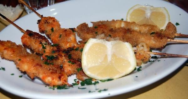 Lui mangia il calamaro fritto e s'infilza la lingua, sfila l'oggetto con forza e questo rimbalza sul piatto infilzando l'occhio della moglie
