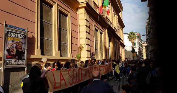 NAPOLI. “La scuola non vuole tacere: parla e chiede aiuto". Si legge così sullo striscione che questa mattina le maestre della scuola elementare De Amicis hanno srotolato davanti all'istituto, in segno di solidarietà alla collega oggetto delle scritte offensive lasciate sui muri. Con le maestre, ha partecipato al flash mob anche il personale amministrativo della scuola e i tanti genitori che questa mattina hanno accompagnato i bambini a scuola. «La frase che vedete - ha spiegato la dirigente Adelia Pelosi - è stata scritta da uno dei nostri bambini. Per questo ci piace ancora di più stare qui stamattina ed esporre questo striscione. Chiediamo aiuto per la scuola, non solo per la nostra ma per tutte le scuole. Vorremmo sentire la società più vicina a quello che noi facciamo. L'impressione che abbiamo e che la scuola sia rimasta sola a fare percorsi di responsabilità e rispetto. Abbiamo intorno a noi modelli terribili - ha concluso - ma resistiamo».