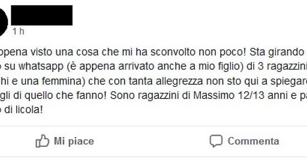 Alle 14.01 scriveva: «Ho appena visto una cosa che mi ha sconvolto non poco! Sta girando un video su whatsapp (è appena arrivato anche a mio figlio) di 3 ragazzini che (due maschi e una femmina) che con tanta allegrezza non sto qui a spiegare i dettagli di quello che fanno! Sono ragazzini di massimo 12/13 anni e pare siano di Licola!».