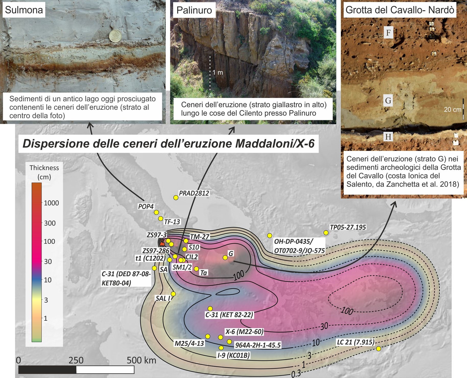 Attraverso questo approccio multidisciplinare, comunemente applicato ad eruzioni recenti le cui tracce sono chiaramente documentate intorno al vulcano, i ricercatori hanno ricostruito i principali parametri eruttivi di un’antica eruzione Flegrea di 109.000 anni fa, denominata ‘Eruzione di Maddaloni’, pressoché inaccessibile nell’area del vulcano ma ben documentata dalle ceneri depositate in aree remote, note con la sigla ‘X-6’ e rinvenute in un’ampia area del Mediterraneo, dall’Italia centrale fino alla Grecia.