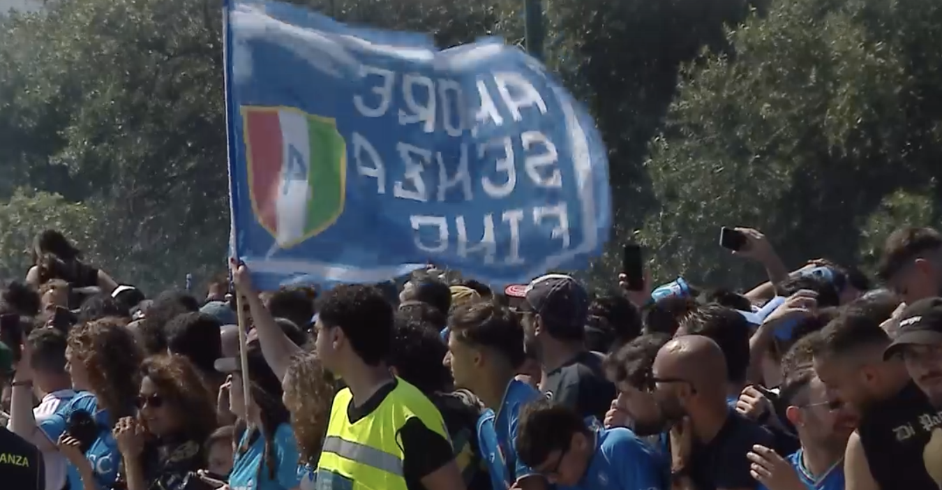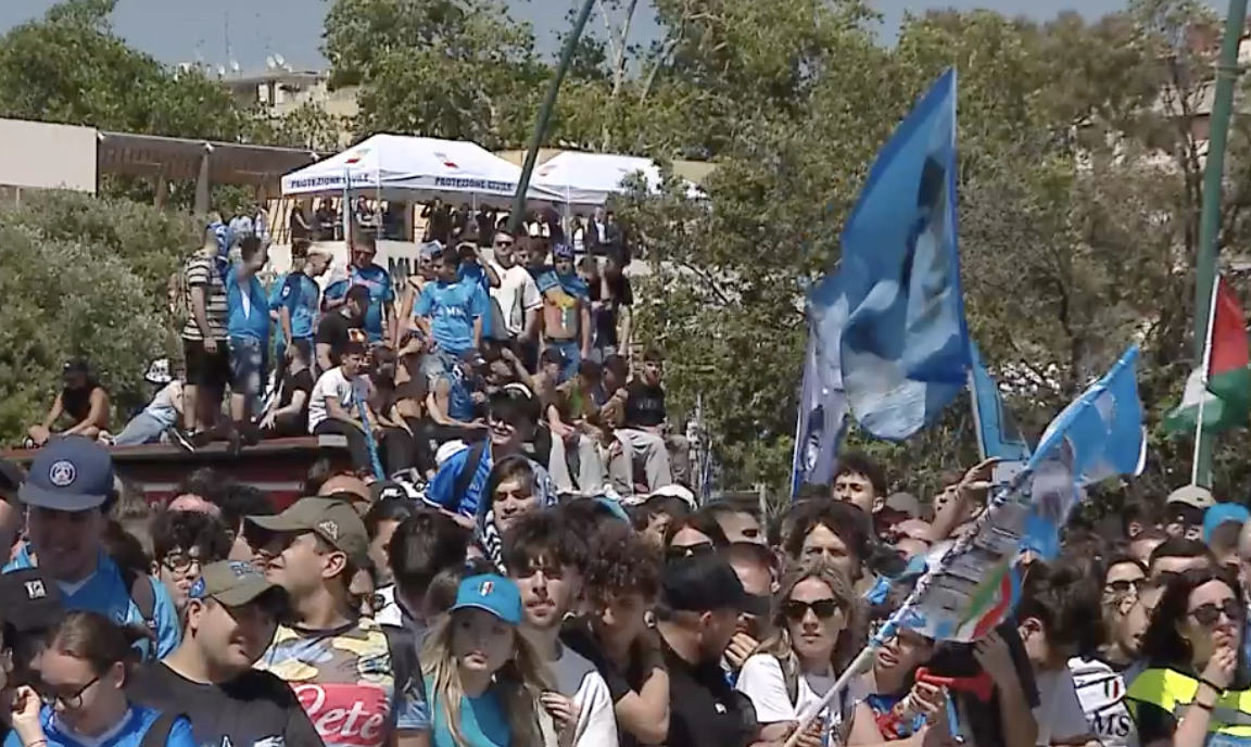 I giocatori e i dirigenti del club sono arrivati al molo Luise di Mergellina a bordo di un aliscafo, accolti dal suono delle sirene delle barche attraccate nel porto. È assordante il clamore delle migliaia di tifosi che sono distribuiti su tutto il lungomare, armati di bandiere che spuntano sempre più numerose.