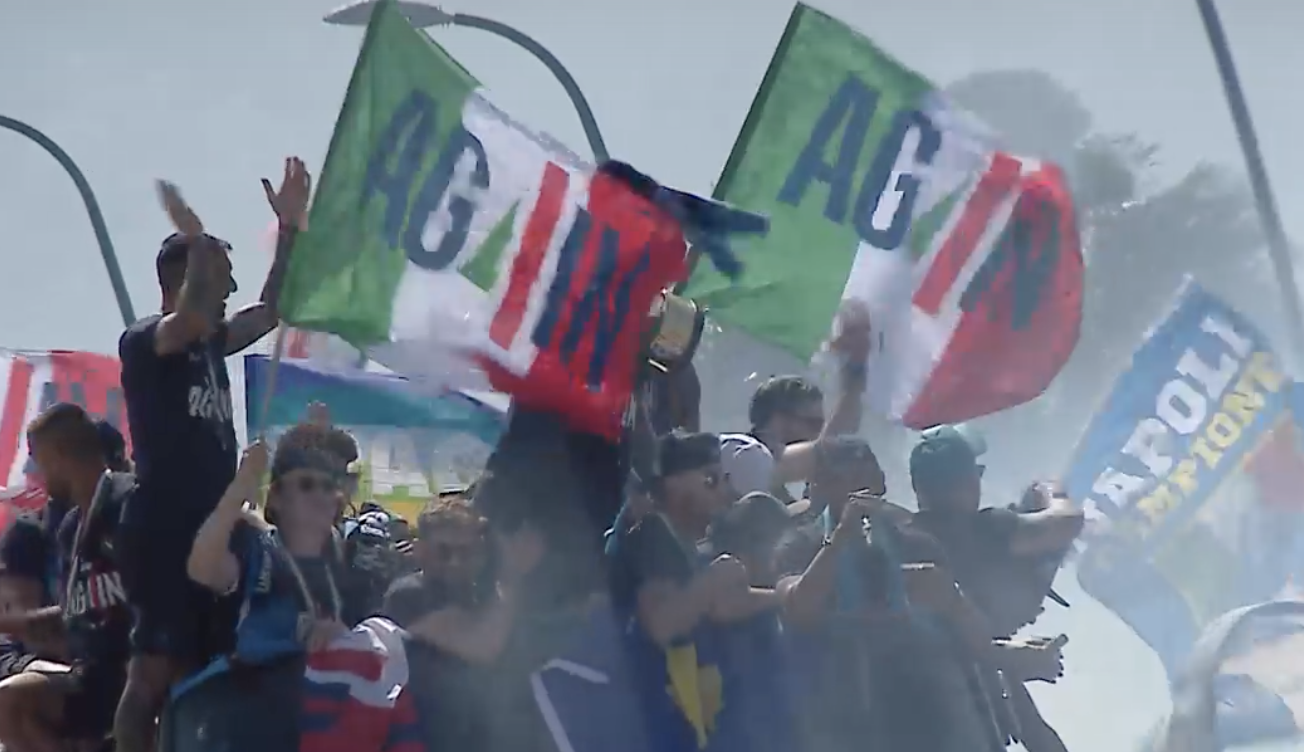 Migliaia di tifosi azzurri sono riusciti a entrare nell'area “protetta" del lungomare, e hanno circondato i bus scoperti con a bordo la squadra e lo staff, che avrebbero dovuto procedere lungo la strada sgombra. I due automezzi comunque proseguono la marcia, a passo d'uomo, mentre la folla esultante non ne ostacola il cammino.