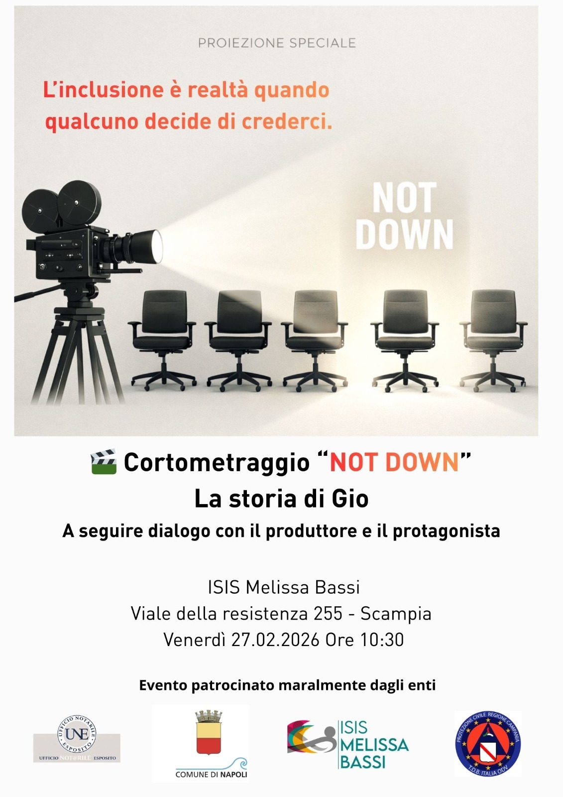 “Not Down” - questo il titolo del docufilm - racconta la storia reale di Giovanni, un ragazzo che è stato assunto con un contratto di tirocinio di due anni nello studio di un notaio in provincia di Ferrara.