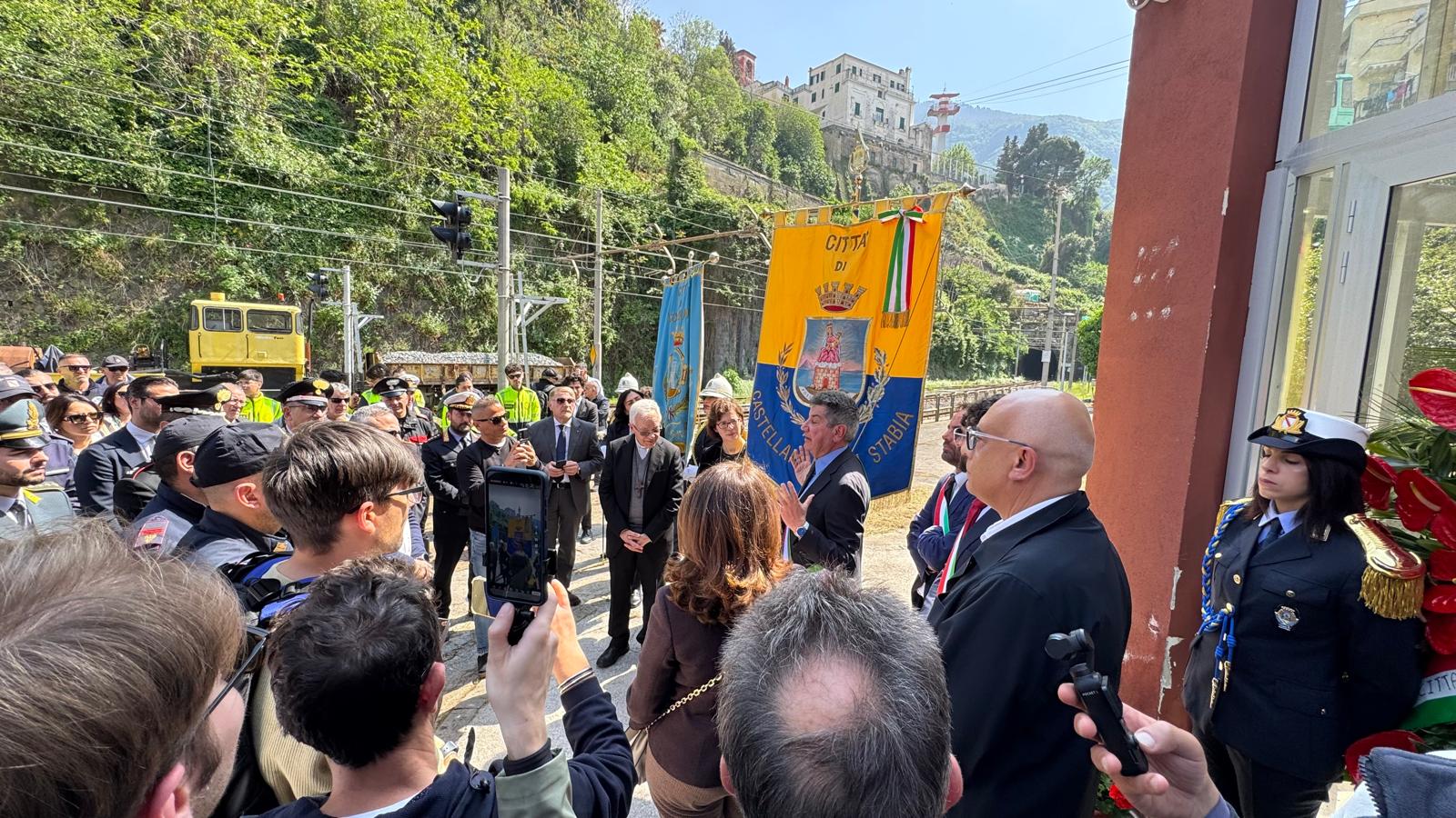 Il primo cittadino ha poi ricordato come il Monte Faito «un luogo di straordinaria bellezza, sembra segnato da ingiuste tragedie», riferendosi al crollo della funivia nel 1961, poi alla difficile ripresa, a cui seguì - circa 30 anni fa - la sparizione della piccola Angela Celentano. Quella vicenda segnò di nuovo il declino della montagna e poi, ha aggiunto Vicinanza, «il sogno era rinato con la messa in opera della nuova Funivia che porta dal mare alla cima del monte in soli 8 minuti, in uno scenario unico al mondo. Un sogno spezzato dalla tragedia dello scorso anno, ma con la speranza di una nuova rinascita, come è scritto nello stemma civico della città di Castellammare di Stabia: "Post fata resurgo"».