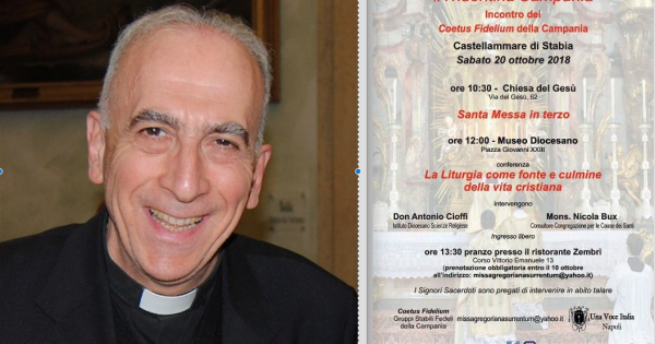 Nella chiesa del Gesù, in via del Gesù a Castellammare di Stabia - dove ogni domenica mattina si raccolgono i fedeli stabiesi che seguono la Messa in rito tridentino - alle ore 10.30 di sabato, Don Antonio Cioffi celebrerà la Messa. Subito dopo, nel Museo Diocesano in piazza Giovanni XXIII, Don Cioffi e Mons. Nicola Bux, teologo e Consultore della Congregazione per le Cause dei Santi, terranno una conferenza su “La Liturgia come fonte e culmine della vita cristiana”.